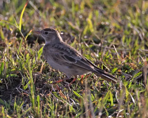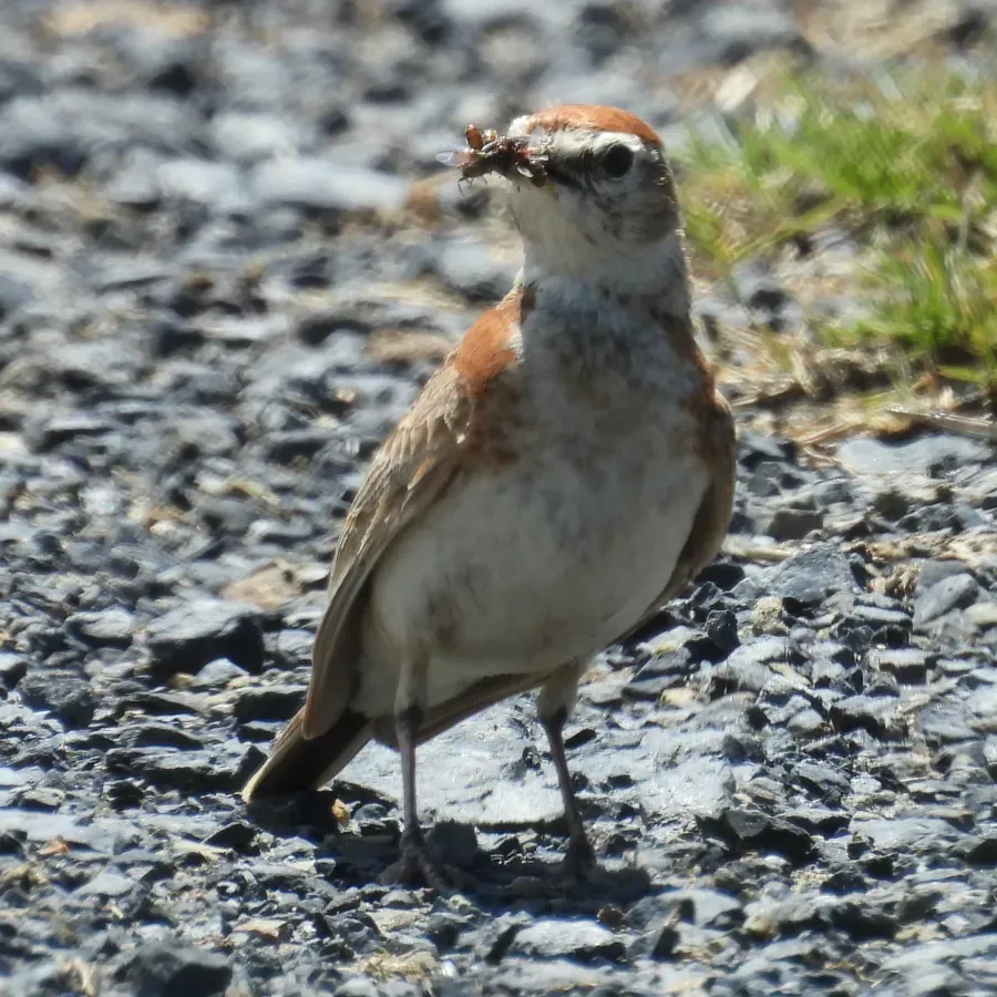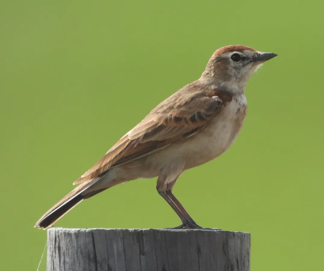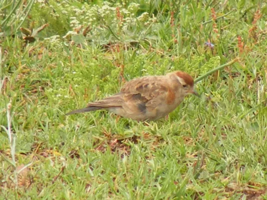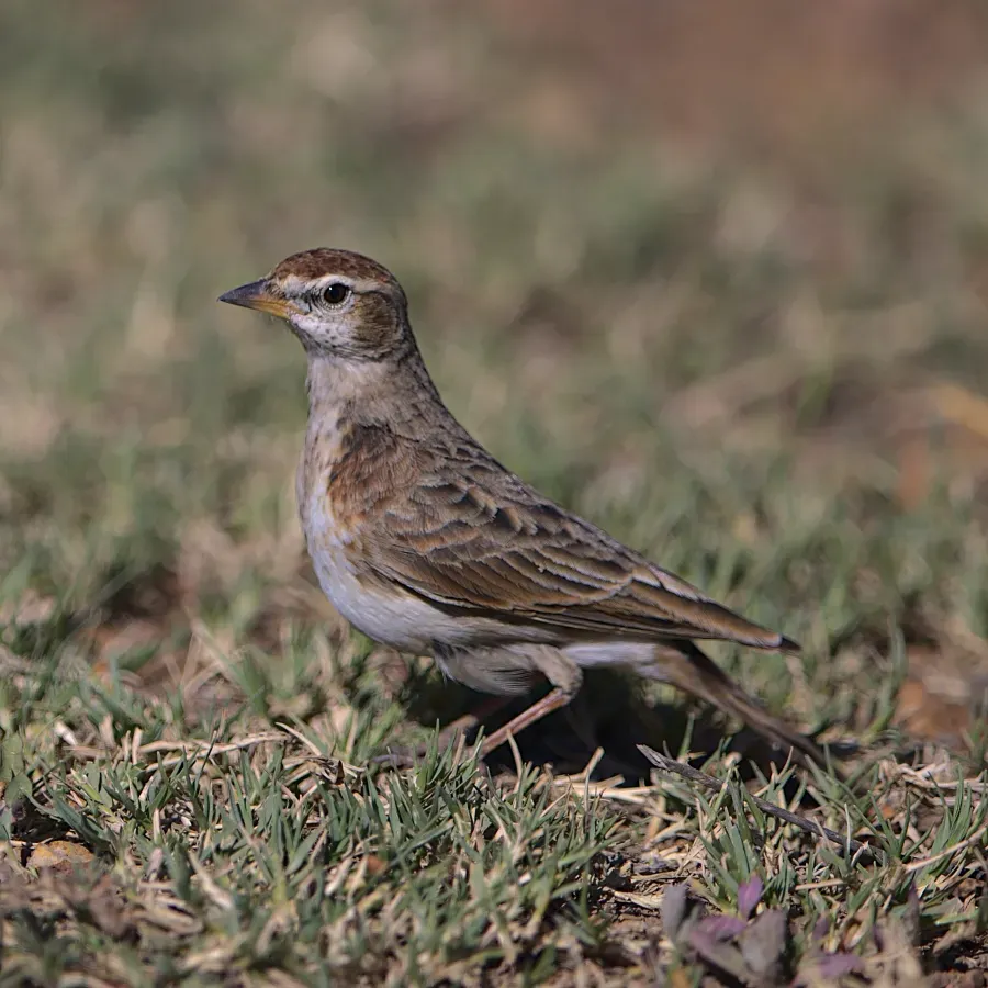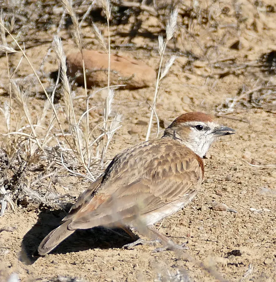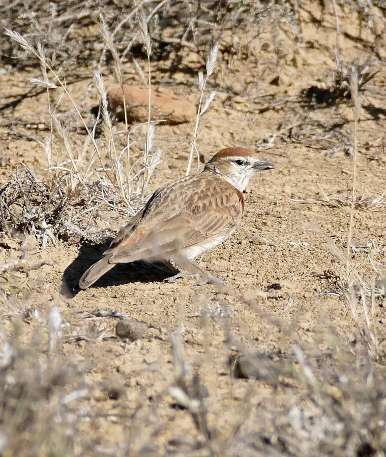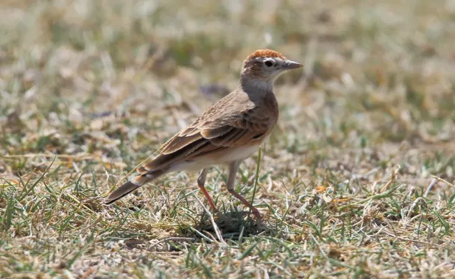 A widespread and variable lark species, typically identified by its distinctive reddish-brown crown and a dark patch on the breast sides. Its plumage otherwise varies from sandy to rufous brown, streaked above.